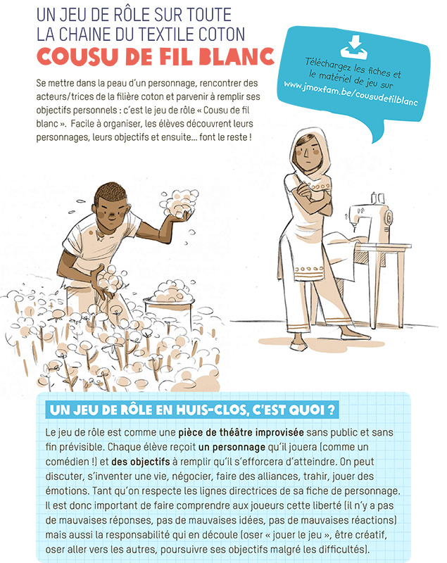 Cette ressource propose un jeu de rôle autour des acteurs/trices de la chaîne du coton dans l'industrie du textile. Les élèves sont invités à jouer le rôle d'une personne en lien avec la fabrication ou la vente d'un vêtement en coton. Ils devront atteindre des objectifs en négociant des contrats avec les autres acteurs/trices répartis dans deux espaces, Nord pour les consommateurs et Sud pour les producteurs. Après 45 min de jeux, l'enseignant-e procédera à un débriefing. D'autres ressources d'éducation21 (voir sous Ressource supplémentaire) pourront être utilisées pour amener des informations sur les impacts de l'industrie textile et les pistes d'actions possibles pour limiter ces impacts . L'activité permet d'exercer des compétences comme le changement de perspectives et la pensée systémique. Attention, les illustrations sont assez stéréotypées (un PDG, une couturière etc).