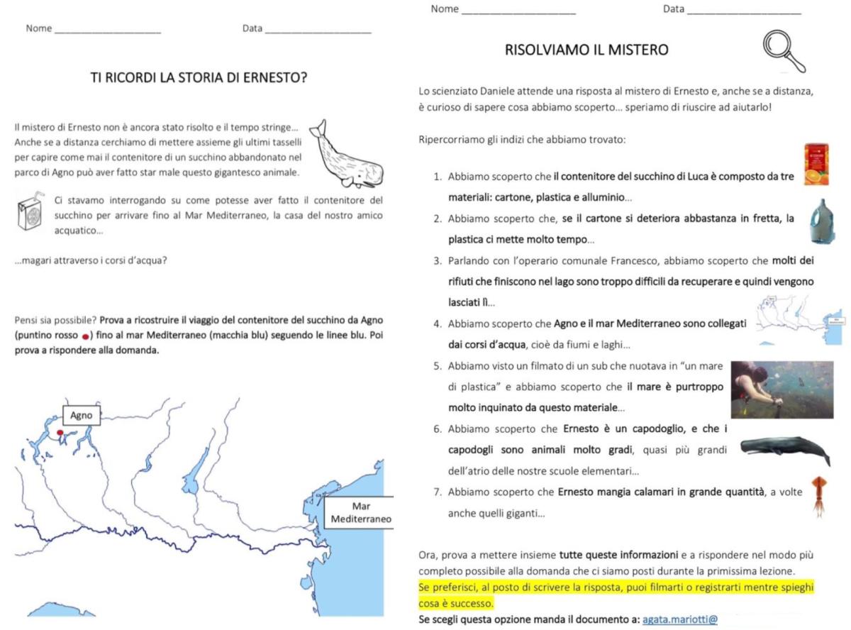 Die Anregung für diesen Leitfaden stammt aus Agata Mariottis Bachelorarbeit «Il caso di Ernesto» («Der Fall Ernesto») aus dem Jahr 2020. Die daraus zitierten Beispiele ermöglichen ein besseres Verständnis der einzelnen Phasen zur Erarbeitung eines Mysterys. Mariotti thematisiert die Verschmutzung der Gewässer durch Abfälle, insbesondere durch Plastikmüll – eine Thematik, mit der sie sich im Rahmen ihrer Ausbildung in einer 2. Primarklasse in Agno auseinandersetzte.
