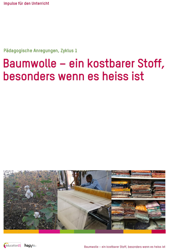 Baumwolle wird nicht in der Schweiz produziert, wird aber fast von allen getragen und geschätzt. Die Thematisierung der Ressource schafft einen direkten Lebensweltbezug. Das Medium befasst sich mit der Pflanzenaufzucht, den Herstellungsprozessen und deren Standorten, den Arbeitsbedingungen, aber auch mit Import und Recycling. Verschiedene Methoden wie reflektieren, experimentieren, sowie kreative Arbeitsphasen unterstützen die Schüler/-innen bei der Erarbeitung überfachlicher Kompetenzen. Didaktische Anregungen werden durch ein Informationsdokument für Lehrpersonen ergänzt.