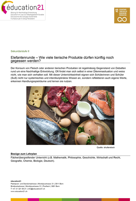 Diese Unterrichtseinheit bietet die Möglichkeit, fächerübergreifend zu arbeiten. In ausgewählten Fachdisziplinen erweitern Schülerinnen und Schüler ihr Wissen rund um die BNE-Frage: "Wie viele tierische Produkte dürfen künftig noch gegessen werden?" In einem Podiumsgespräch werden Pro und Contra diskutiert.