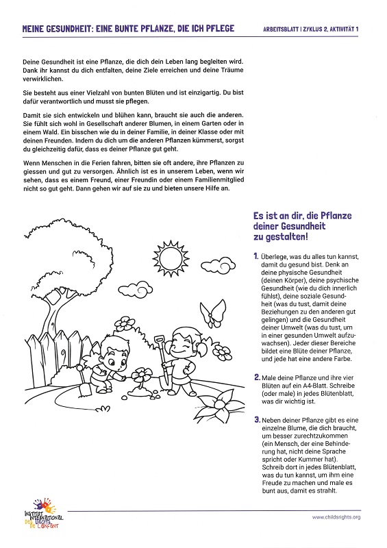 Zyklus 2: Veranschaulicht anhand einer Pflanze sollen die Kindern verschiedene Aspekte der Gesundheit erkennen sowie ihrer eigenen gesundheitlichen Bedürfnisse und der Bedeutung zwischenmenschlicher Beziehungen bewusst werden.
