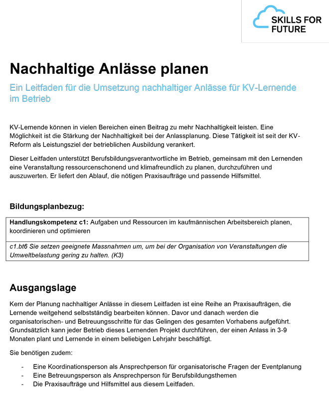 Der Leitfaden unterstützt KV-Lernende bei der Planung nachhaltiger Anlässe im Betrieb, was seit der KV-Reform als Lernziel gilt. Lernende übernehmen Aufgaben wie Verpflegung, Mobilität oder CO2-Analyse, während Koordinations- und Betreuungspersonen sie begleiten.
