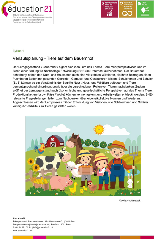 Die Verlaufsplanung «Tiere auf dem Bauernhof» bietet Lehrpersonen einen Überblick, den Lerngegenstand «Bauernhof» mehrperspektivisch im Unterricht zu behandeln. BNE-relevante Fragestellungen, thematische Fokusse und didaktische Hinweise unterstützen die Lehrperson in der Feinplanung.