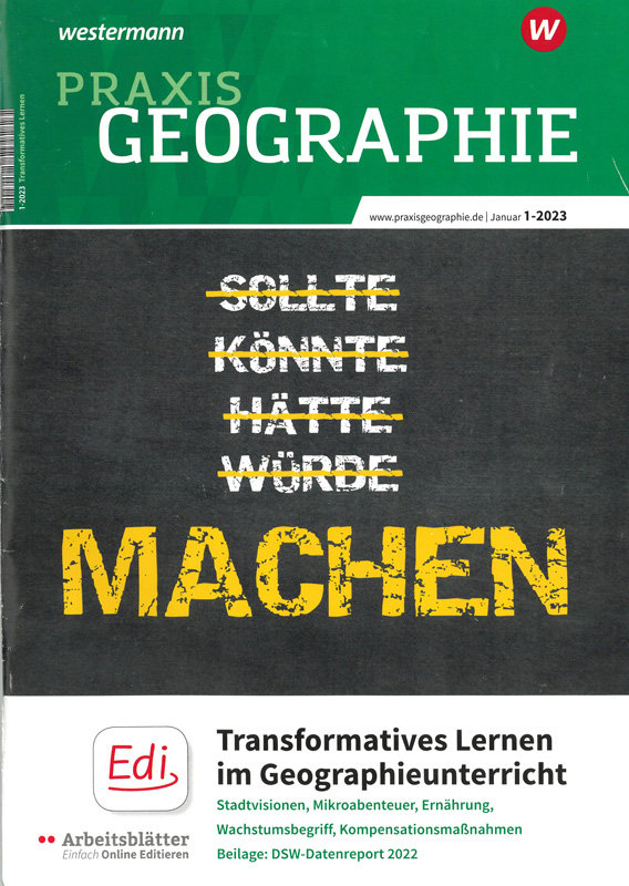 Die vorliegende Ausgabe von Praxis Geographie widmet sich dem transformativen Lernen im Geographieunterricht. Zunächst besticht das Heft mit einer lesenswerten Einleitung, welche diese Art des Lernens vorstellt und in den Kontext von BNE einordnet. Dabei wird auch ein interessantes didaktisches Modell zur Planung und Gestaltung von Unterricht - der Handlungsrahmen für transformatives Lernen von Pettig vorgestellt. Die Schüler/-innen befassen sich auf spannende Weise mit interessanten Methoden (Planspiel, Philosophisches Gespräch, Mikroabenteuern etc.) u.a. mit der Stadt der Zukunft, der Umgestaltung eines ehemaligen Flughafenareals, der Frage nach der Notwendigkeit von Wirtschaftswachstum oder mit dem Beitrag der Transformation an Treibhausgasneutralität. Sie werden gefordert Position zu beziehen, diese zu reflektieren und motiviert sich gedanklich auf den Weg zu machen, um neue zukunftsweisende Lösungen zu finden, welche mindestens gedanklich erprobt werden.