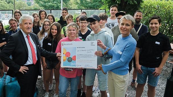 Bild: Preisübergabe an die Gewinnerklasse der nationalen Challenge durch Klára Sokol, Direktorin von éducation21, und den Berner Ständerat Hans Stöckli. Foto: © Free. Fair. Future.