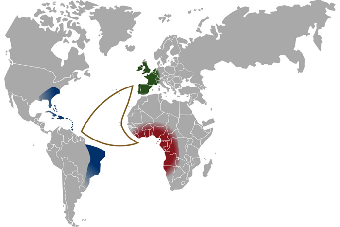Zucker entwickelte sich zu einem zentralen Gut der Kolonialzeit und des «transatlantischen Dreieckshandels»: Europäische Schiffseigner tauschten Waren gegen Menschen aus Afrika, die sie anschliessend als Sklaven in Amerika verkauften. Die Schiffe kehrten mit Produkten aus den dortigen Kolonien nach Europa zurück, wozu auch der kostbare Rohrzucker zählte. Schweizer Textilunternehmen mischten mit den an afrikanischen Fürstenhöfen beliebten «Indiennes-Stoffen» ebenfalls beim transatlantischen Sklavenhandel mit.