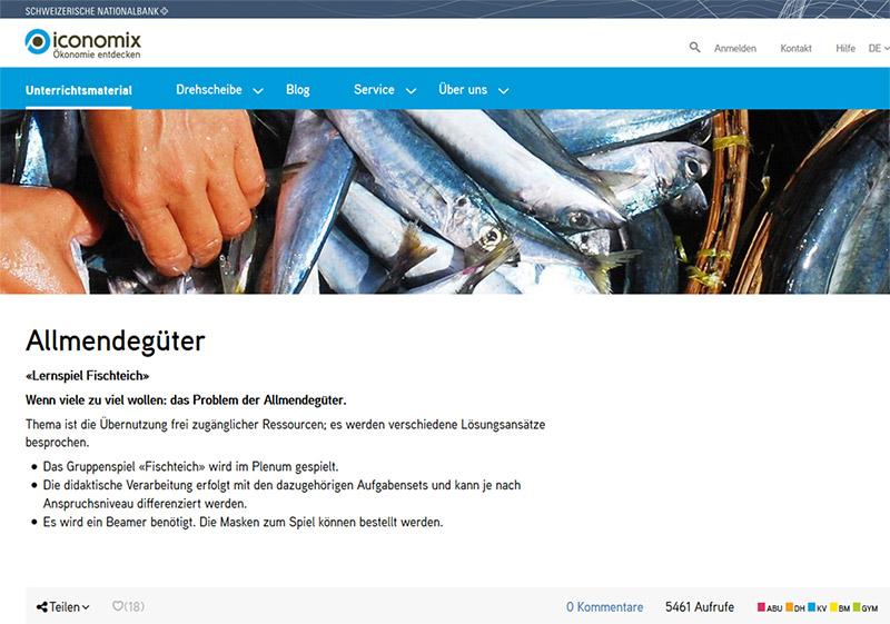 Ausgehend vom Fischteichspiel wird die nicht nachhaltige Nutzung frei zugänglicher Ressourcen (Allmendegütern) erlebbar gemacht.  Es folgt eine Reflexionsphase und der Transfer auf andere Beispiele von Dilemmata einer nachhaltigen Nutzung.