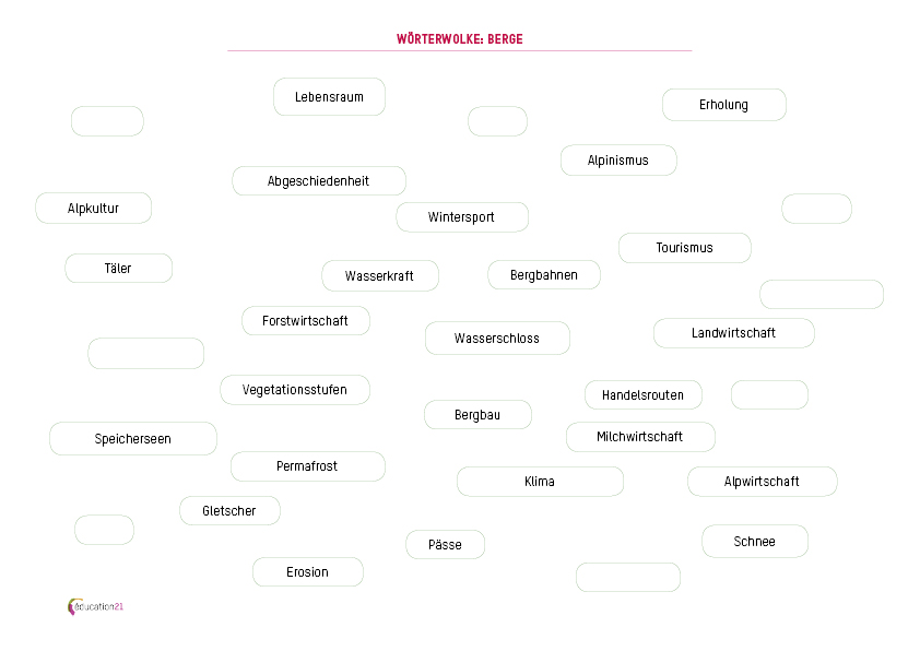 Gebirge sind herausragende Geländeformen der Erdoberfläche mit unterschiedlichen Hangneigungen, Expositionen sowie vielfältigen Reliefformen. Die grossen Höhenunterschiede und die vielfältige Topografie ergeben ein Klima, das sowohl Tiere und Pflanzen als auch den Menschen prägt. Dank der verhältnismässig grossen Niederschlagsmengen, die in Gletschern, Seen und in der Vegetation gespeichert werden, sind Gebirge auch wichtige Wasserspeicher. Für Menschen sind Gebirge Durchgangsraum, Lebensraum, Ressourcen, Orte der Erholung, Spiritualität und Naturverbundenheit. Diese vielfältigen Ansprüche und Aktivitäten auf engem Raum generieren Interessenskonflikte und Synergien und bieten damit für Bildung für Nachhaltige Entwicklung viele interessante und herausfordernde Fragestellungen.