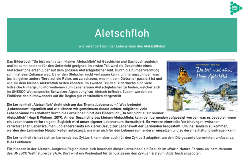In Verbindung zum Bilderbuch «Du bist nicht allein, kleiner Aletschfloh» hat die BNE-Fabrik eine Unterrichtseinheit zum Klimawandel und dem eigenen Lebensraum im Umfang von 11-13 Lektionen entwickelt. Die Problematik des Aletschflohs, dessen Zuhause wegschmilzt, wird in der Lerneinheit durch entdeckende und mehrperspektivische Zugänge aufgegriffen und durch weitere inhaltliche und problemorientierte Fragestellungen vertieft.