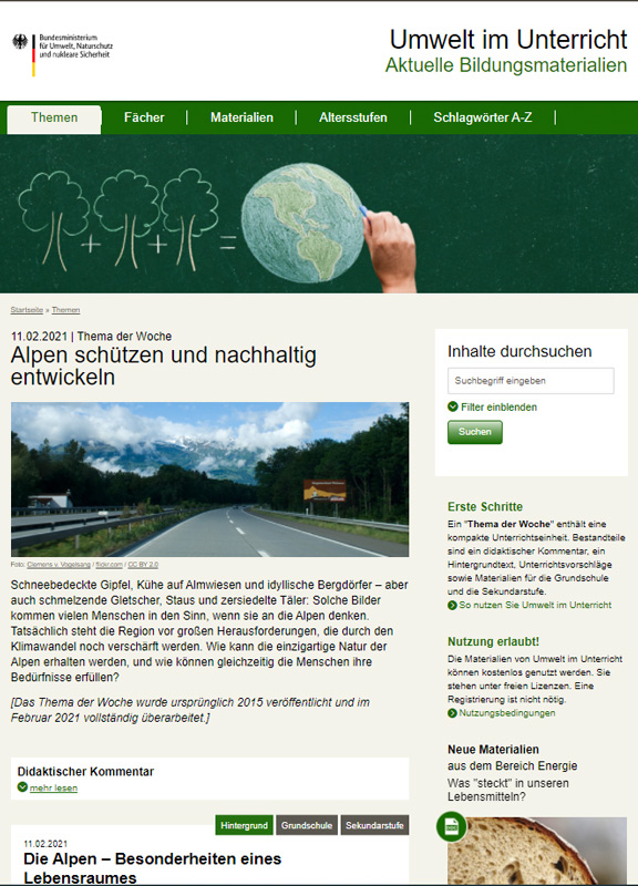 «Umwelt im Unterricht» des deutschen Bundesministeriums für Umwelt, Natur und nukleare Sicherheit bereitet alle zwei Wochen aktuelle Umweltthemen für den Unterricht auf. Ein "Thema der Woche" ist eine kompakte Unterrichtseinheit mit dem Ziel, langfristig relevante Themen in Richtung Nachhaltigkeit zu verknüpfen.AlpMonitor