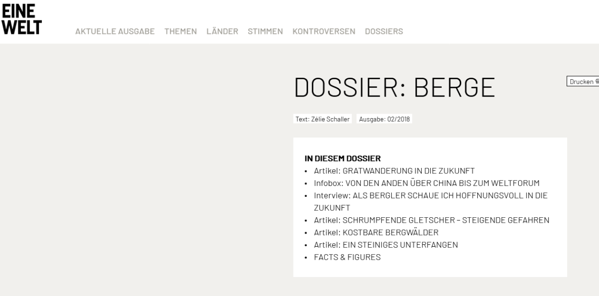 Das Dossier der DEZA zeigt die Bedeutung von Bergregionen als Wasserschlösser der Welt und ihre zentrale Bedeutung für Landwirtschaft, Ernährungssicherheit und Biodiversität. Als Ökosysteme reagieren sie speziell sensibel auf die Auswirkungen des Klimawandels und sind entsprechend stark bedroht. Dabei stehen sie für Ansätze einer weltweiten Nachhaltigen Entwicklung.Alpen-Initiative