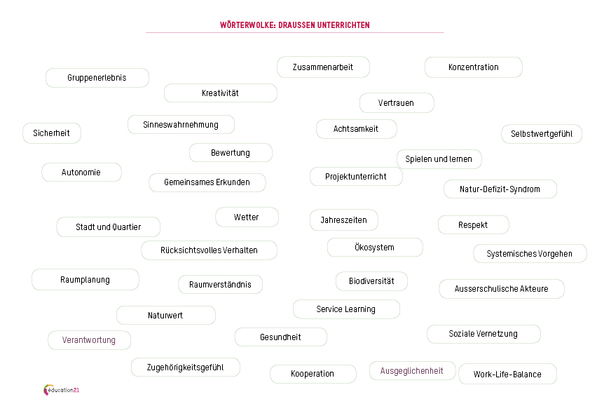 «Draussen unterrichten» überschreitet die Grenzen des Klassenzimmers und ermöglicht mehr Bewegungsfreiheit. Von einzelnen Ausflügen bis hin zum gesamten Schulprogramm, das ausserhalb der Schulgebäudes umgesetzt wird: Es gibt unzählige Möglichkeiten, in konkreten Situationen zu lernen, gesellschaftlichen Akteuren zu begegnen und Schulfächer so zu gestalten, dass sich Kinder und Jugendliche BNE-Kompetenzen aneignen können.