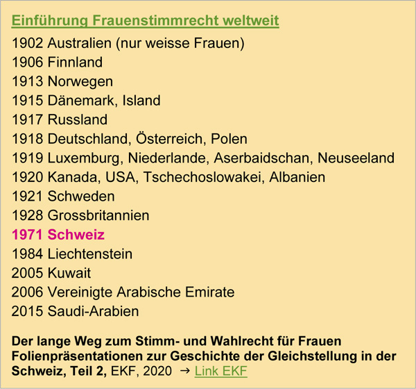 Dieses Buch stellt 100 einzigartige Frauen vor (jung/alt, früher/heute, aus Wissenschaft, Kunst, Politik, Sport, Musik, Literatur, Forschung...), die etwas Beeindruckendes in ihrem Leben gemacht haben. Die biografischen Texte sind gut verständlich und eignen sich bestens für den Unterricht. Ergänzend zum Buch: englischsprachiger Podcast (als Hörbuch auch auf Deutsch).50 Jahre Frauenstimmrecht in der Schweiz (Lernplattform)