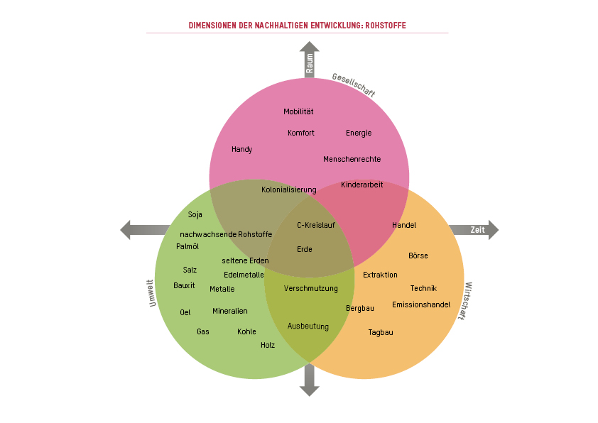 Die Unterrichtseinheiten sind methodisch vielfältig ausgelegt und fokussieren auf verschiedene Aspekte rund um den Abbau von Rohstoffen: So werden die drei Dimensionen der Nachhaltigen Entwicklung – Gesellschaft, Umwelt und Wirtschaft – berücksichtigt und die Auswirkungen auf lokaler sowie globaler Ebene untersucht.Menschen.Nutzen.Natur