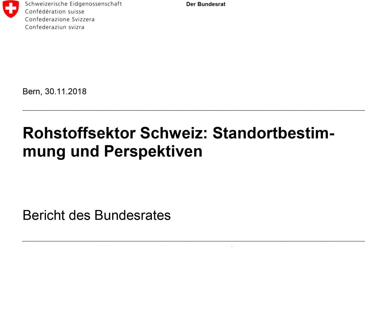 In seinem Bericht «Rohstoffsektor Schweiz: Standortbestimmung und Perspektiven» beschreibt der Bundesrat die besondere Stellung des Rohstoffsektors für die Schweiz und zeigt auf, welche Herausforderungen damit verbundenen sind und wie sie gemeistert werden sollen.Magazin Public Eye (PDF)