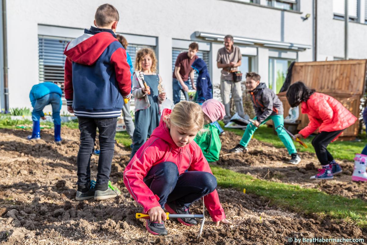 Das Schulareal bietet einen idealen Lernort für Bildung für Nachhaltige Entwicklung (BNE). Die Schülerinnen und Schüler erkunden Tiere und Pflanzen in einer vertrauten, nahen Umgebung (NMG 2.1). Sie überlegen, was Tiere, Pflanzen und auch Menschen brauchen, um sich auf dem Schulareal wohlzufühlen und den Lebensraum gemeinsam nutzen zu können (NMG 2.2). Darüber hinaus orientieren sich die Schülerinnen und Schüler im Raum: Sie lernen, sich auf dem Areal zurechtzufinden, Objekte zu bestimmen (NMG 8.1) und jahreszeitliche Veränderungen bewusst wahrzunehmen (NMG 8.3). In angeleiteten Sequenzen reflektieren sie ihre Beziehung zum Lebensraum «Schulareal» und übernehmen Verantwortung – etwa beim Anlegen und Pflegen eines eigenen Schulgartens (NMG 2.6). Ein Schulgarten, sei es als Topfgarten, Hochbeet oder klassisches Gemüsebeet, ermöglicht zudem lebensnahe Erfahrungen mit der Produktion von Gütern und der Verarbeitung von Rohstoffen (NMG 6.3).