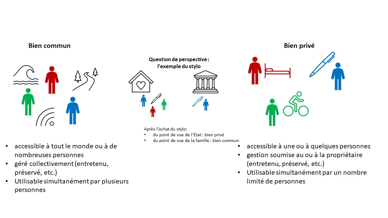 À qui appartient le crayon que j’utilise pour écrire ? Qui veille à ce que ma place de jeux préférée soit bien entretenue et sûre ? Est-ce que les forêts et les lacs changent si nous y jouons ou nageons souvent ?