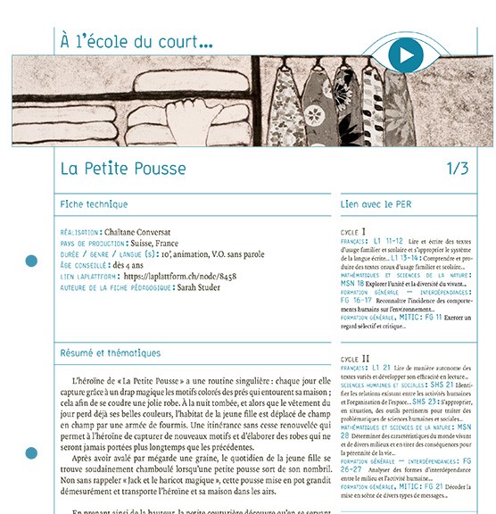 Fiches pédagogiques qui accompagnent quatre court métrages d’animation, trois de production suisse dont un primé disponibles gratuitement sur laPlattform (La petite Pousse ; Abuela Grillo ; Les Gratte-Ciel ; Obèse Blues). Les 4 courts-métrages permettent d'aborder de manière créative et symbolique des questions actuelles en lien avec notre développement: utilisation des ressources naturelles, eau, inégalités, développement économique, image de soi et du monde.Un pur plaisir