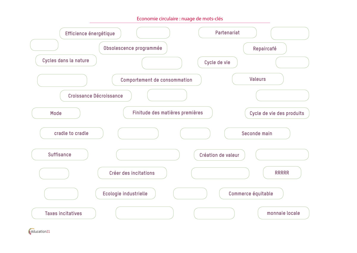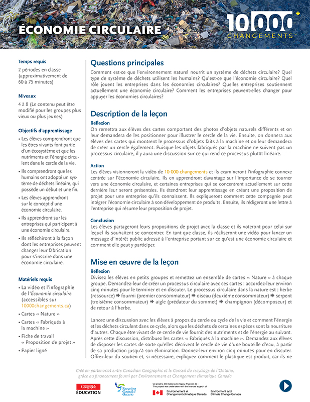 Le module commence par une période de réflexion-discussion sur le cycle de la nature et la comparaison avec des objets fabriqués. En s’appuyant sur une vidéo et une infographie on apprend davantage sur l’ économie linéaire et l’économie circulaire. A partir de là, les élèves peuvent créer une proposition de projet pour une entreprise qu’ils connaissent. Ils expliquent comment cette compagnie peut intégrer l’économie circulaire à son développement de produits. Ils rédigent une lettre à l’entreprise qui résume leur proposition de projet.Quand voyagent les marchandises : De l'approvisionnement à l'élimination