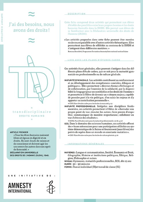 Les différentes fiches proposées par Amnesty international sont des outils prêts à l'emploi pour les enseignants du secondaire II et écoles professionnelles pour introduire les Droits humains et approfondir l'un ou l'autre de ces droits par le biais de sujets actuels: discriminations, mobbing, migrations, liberté d'expression, droit d'asile, etc.Egaux sans ego