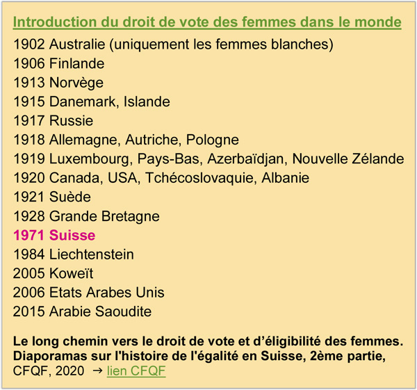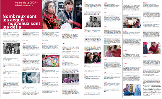Deux posters pour avoir sous les yeux toutes les dates clés de l’histoire de l’égalité. En 1976, le Conseil fédéral instituait la Commission fédérale pour les questions féminines CFQF qui s’engage pour les droits des femmes. Cette feuille d’information retrace à travers 40 événements le long chemin parcouru pour progresser vers l’égalité entre femmes et hommes. Le nouveau poster "Les 50 ans du suffrage féminin. 1971-2021: Faits et chiffres au niveau suisse et international".Film youtube sur la CEDAW-CEDEF (3’03) - (Cycle 3 - Sec II)
