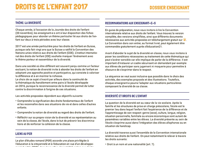 Les activités pour le cycle 1 permettent de travailler, sur 2 à 3 périodes, les objectifs suivants: identifier et reconnaître les droits fondamentaux de l’enfant; comprendre la notion de diversité au regard des droits de l’enfant; réfléchir sur sa propre vision de la diversité et sa représentation au sein de la classe, dans le but de prévenir les discriminations et renforcer la cohésion du groupe.Oser les questions vives