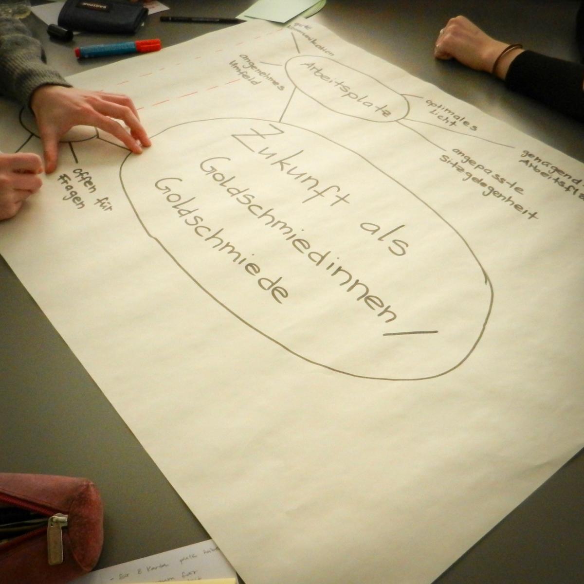 Suivant les instructions de l’animatrice de l’atelier de Design Thinking, les participant.e.s ont suivi les six étapes de la méthode. La question suivante s’est cristallisée au cours de la démarche : « Comment aimeriez-vous travailler à l’avenir en tant qu’orfèvres ? Comme se présente pour vous le poste