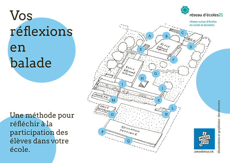 La participation des élèves est à la fois un principe d'action et une compétence pour l'éducation en vue d'un développement durable comme pour la promotion de la santé et la citoyenneté. Favoriser la participation active des élèves n’est pourtant pas toujours aisé à l’école. Le Réseau d'écoles21, Réseau suisse d'écoles en santé et durables propose un outil concret et prêt à l'emploi pour explorer comment aller de l'avant dans son école. Sachant qu'une balade en extérieur offre le terreau idéal pour favoriser la naissance et l’exploration de nouvelles idées : associer ses jambes à sa tête pour se mettre en mouvement –au sens propre comme au figuré. Et ça marche aussi pour les adultes! L'outil est disponible sous forme de 3 balades: "Vos idées en balade" décliné pour les élèves des cycles 1-2 et pour les étudiant-e-s des cycle 3-second. II et "Vos réflexions en balade" pour l'ensemble des professionel-le-s scolaires. Matériel gratuit et téléchargeable avec mode d'emploi, panneaux pour les postes et d'autres ressources et textes de base sur la page Participation.
