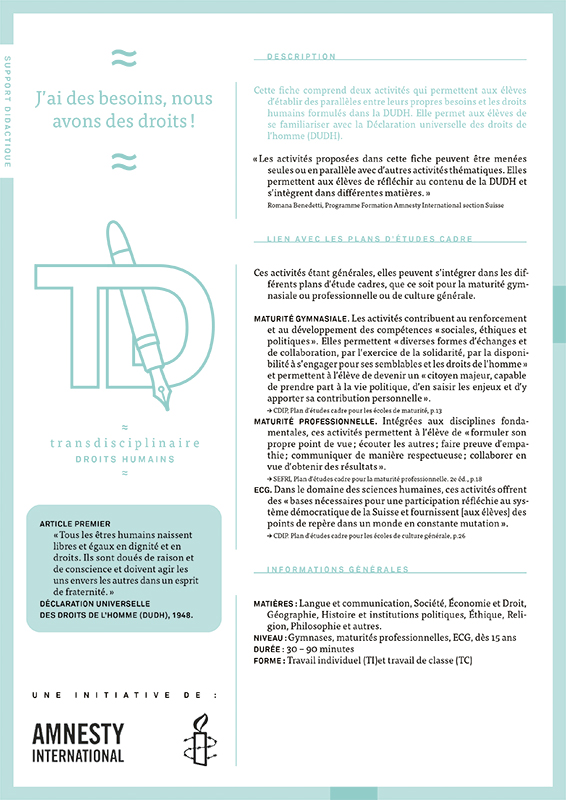 Les différentes fiches proposées par Amnesty international sont des outils prêts à l'emploi pour les enseignants du secondaire II et écoles professionnelles pour introduire les Droits humains et approfondir l'un ou l'autre de ces droits par le biais de sujets actuels: discriminations, mobbing, migrations, liberté d'expression, droit d'asile, etc. La structure des fiches en rend l'usage facile, les liens avec les plans d'étude sont explicites et les indications pratiques permettent de voir rapidement combien de temps et dans quelle discipline spécifique les utiliser. Ces fiches sont un bon appui pour un travail de sensibilisation aux droits humains bien intégré au système scolaire. Par contre elles ouvrent peu de pistes pour faire des liens entre les différentes dimensions du DD tels que l'économie ou l'environnement. Attention au fait que certains documents font clairement référence aux activités d'Amnesty.
