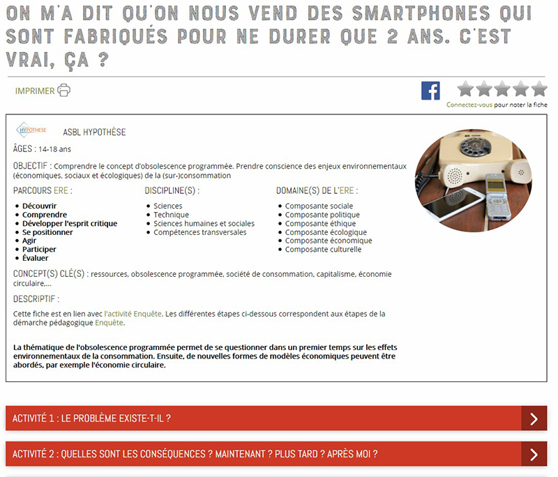 Dans ce jeu d'enquête (version plateau ou en ligne), les élèves abordent le thème de l'obsolescence programmée, un thème proche de leur quotidien fortement influencé par les nouvelles technologies. Articulée autour de cinq activités différentes, cette séquence interrogeant la (sur-)consommation actuelle permet aux élèves de comprendre le concept d'obsolescence programmée, mais aussi les conséquences, les causes et les acteurs clés de cette problématique. Les élèves sont également invités à réfléchir aux actions possibles pour lutter contre les conséquences de la consommation et à les mettre en oeuvre. Ils prennent ainsi conscience des multiples dimensions de cette thématique tout en développant leur sens critique. En réfléchissant aux valeurs et aux interactions qui sous-tendent les modes de consommation actuels ainsi qu'au rôle individuel et collectif de chacun dans ce système, les élèves apprennent à se positionner face à une problématique et s'engagent à agir en conséquence.