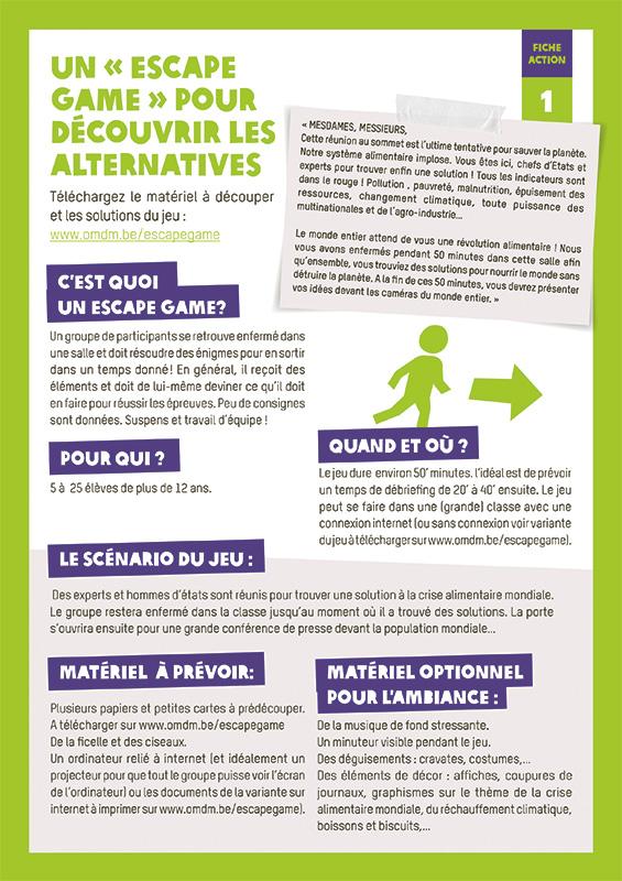 L'intérêt principal de cette ressource réside dans l'aspect jeu. Enfermés dans une salle, les participant-e-s, par groupe, ont 50 minutes pour résoudre diverses énigmes qui leur permettront de sortir. Il s'agit d'abord de comprendre la problématique (les conséquences du système alimentaire actuel), puis d'identifier différentes alternatives. Les participant-e-s en choisissent finalement une qu'ils présenteront soit aux autres groupes de participant-e-s soit à l'enseignant-e.