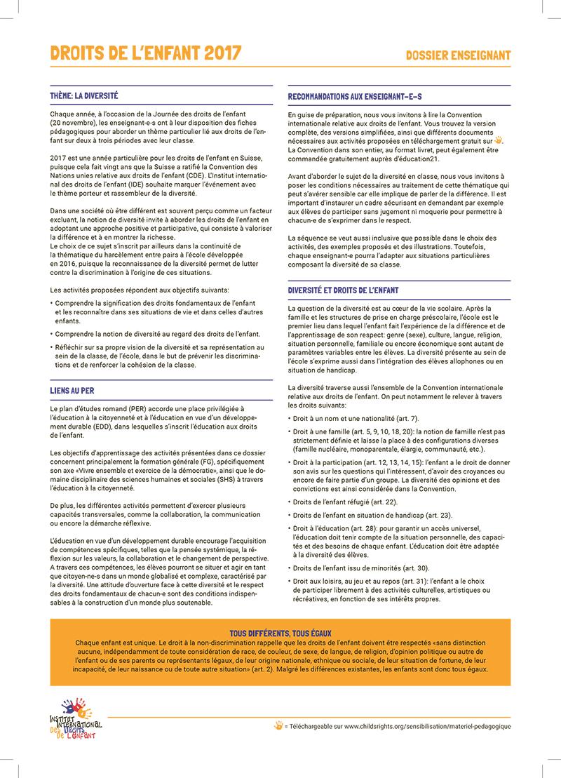 La diversité : Dossier enseignant.e : Fiches Droits de l'Enfant 2017