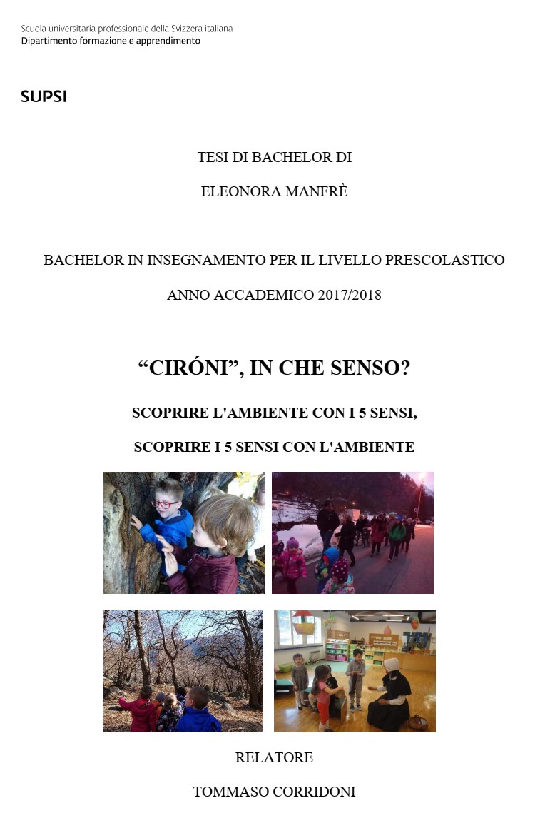 Un percorso didattico comprensivo di uscite nel territorio nel comune di Chironico e discussioni in e su diversi contesti ed elementi del paese che ha portato i bambini alla scoperta sia degli ambienti con i cinque sensi, sia dei cinque sensi attraverso l'ambiente attivando così diverse competenze. Gli elementi approfonditi nell'itinerario sono: l'esplorazione di un antico castagno e del paese stesso, la scoperta delle tradizioni del comune, della neve e del bosco.Attività didattiche di attori esterni