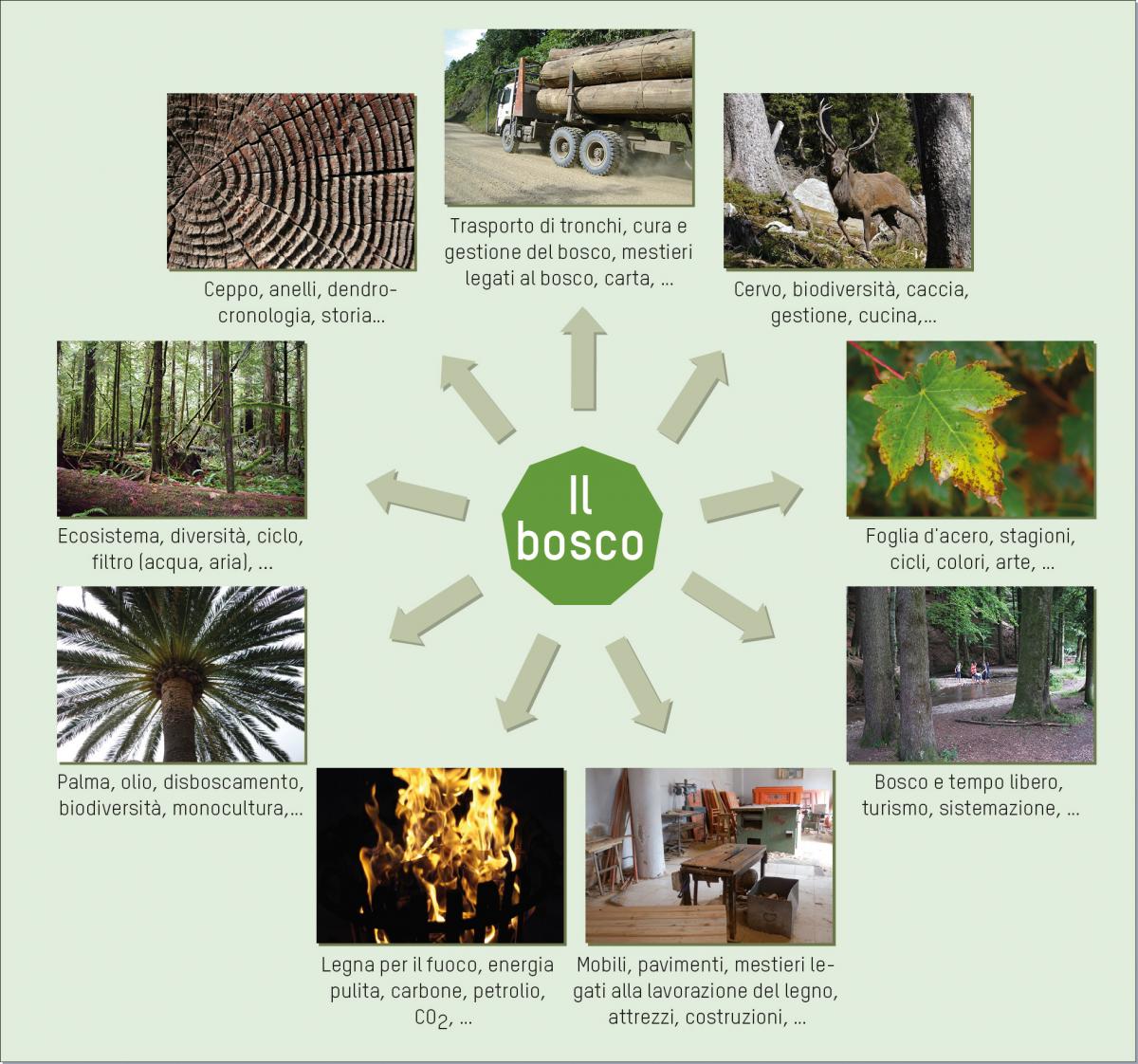 Il bosco è un luogo d’apprendimento interessante per confrontarsi con la sua complessità come ampia comunità di essere viventi che collabora in un equilibrio dinamico, in particolare per studiarlo sia come habitat di piante e animali sia come fonte economica. Nel primo caso esso può divenire oggetto di indagini naturalistiche che analizzano come le influenze umane dirette, come la deforestazione, e indirette, come il cambiamento climatico, modifichino l'ecosistema adottando e mettendo criticamente in discussione le diverse prospettive nella loro complessità. Nel secondo caso invece le studentesse e gli studenti imparano a conoscere il bosco, le sue funzioni e i servizi ecosistemici che svolge e che sono fondamentali per le persone (come ad es. l’impollinazione o la regolazione del clima) e le sue funzioni, come ad esempio quella di combattere i rischi naturali (bosco di protezione) oppure di produrre beni di consumo (castagne, legname, olio di palma, ecc.). In ambo i casi analizzano quindi le conseguenze locali e globali della gestione delle foreste e dell'uso delle risorse, sviluppando un approccio responsabile grazie a una visione sistemica del bosco. Ciò che consente loro di comprendere meglio le varie questioni legate allo sviluppo sostenibile e la complessità dei conflitti di interesse tra gli utilizzatori dei boschi.