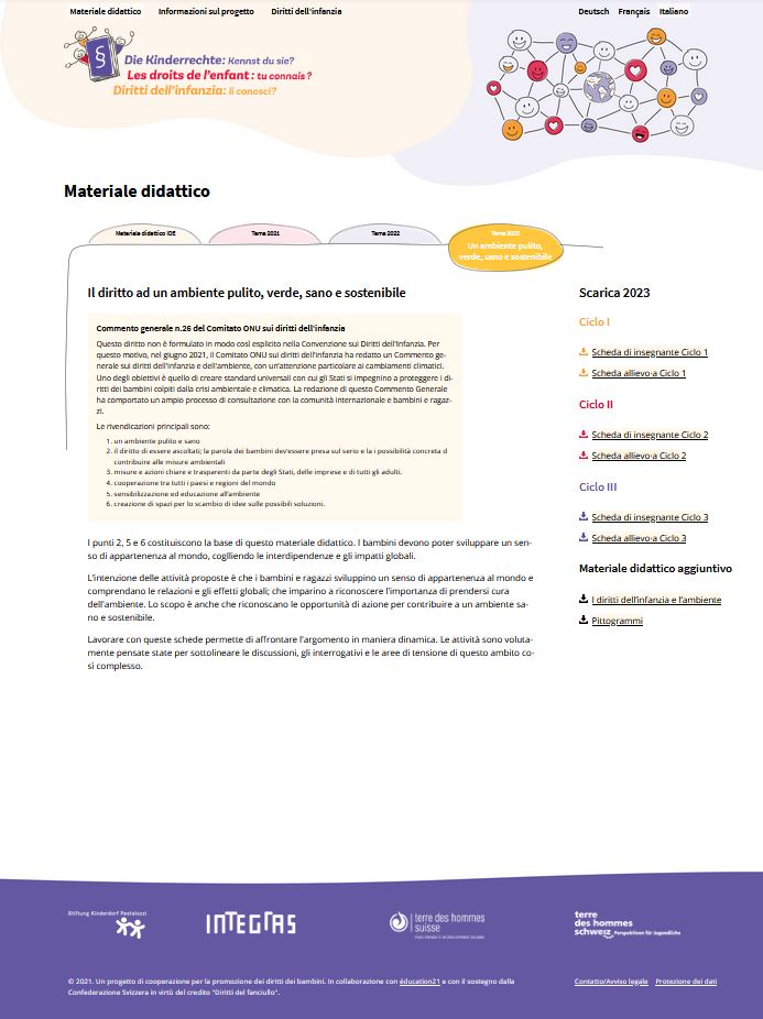 Il materiale didattico per la Giornata dei diritti dell'infanzia e dell'adolescenza 2023 è dedicato al tema dell'ambiente. Il diritto ad un ambiente pulito, verde, sano e sostenibile non è formulato in modo così esplicito nella Convenzione sui Diritti dell'Infanzia. Per questo motivo, nel giugno 2021, il Comitato ONU sui diritti dell'infanzia ha redatto un Commento generale sui diritti dell'infanzia e dell'ambiente, con un’attenzione particolare ai cambiamenti climatici.