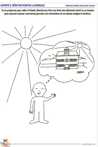 Utilizzando queste schede e le attività correlate, gli allievi riflettono e discutono su come affrontare e resistere in una giornata di canicola per proporre modi per mitigare gli effetti del riscaldamento globale nella scuola. Così facendo, gli allievi s'interrogano come i loro diritti sono influenzati dal cambiamento climatico e sperimentano il diritto alla partecipazione.