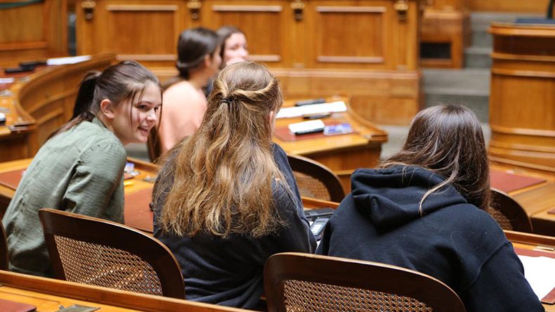 Il modulo didattico «Il mio parere» inizia con una visita guidata a Palazzo federale. In seguito, la classe è invitata a partecipare a un gioco politico, condotto da un moderatore, in cui i giovani si mettono nei panni delle politiche e dei politici. La preparazione della visita richiede circa 6 lezioni e sono messi a disposizione i materiali didattici.