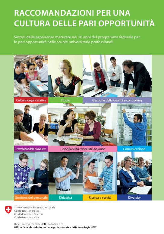 Si tratta di una sintesi delle esperienze maturate nei 10 anni del programma federale per le pari opportunità nelle scuole universitarie professionali, pubblicata dal SEFRI. Essa contiene raccomandazioni sintetizzate in checklist, che si riferiscono agli ambiti operativi rilevanti per le pari opportunità. La pubblicazione si rivolge innanzitutto agli organi direttivi ma anche a tutto il personale delle SUP attivo nella didattica e nella ricerca o che ricopre funzioni trasversali. Inoltre contiene anche una rassegna di esempi di buone pratiche presso le scuole universitarie professionali nell’ambito delle pari opportunità, un glossario specifico e una selezione di pubblicazioni sul tema diffuse dalle SUP o da chi vi lavora.