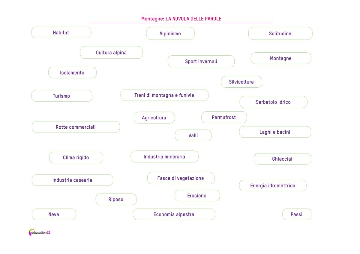 Le montagne sono rilievi che emergono dalla superficie terrestre ed hanno pendenze ed esposizioni diverse così come molteplici forme. I grandi dislivelli e la diversa topografia generano un clima che plasma sia gli animali e le piante che gli esseri umani. Grazie alle quantità proporzionalmente grandi di precipitazioni immagazzinate nei ghiacciai, nei laghi e nella vegetazione, le montagne costituiscono anche importanti serbatoi d'acqua. Per le persone, le montagne rappresentano corridoi di transito, spazio vitale, risorse, luoghi per riposarsi, spiritualità e vicinanza alla natura. Queste molteplici caratteristiche in uno spazio ristretto generano conflitti d'interesse e sinergie ed offrono quindi molte tematiche interessanti e stimolanti per l'educazione allo sviluppo sostenibile.