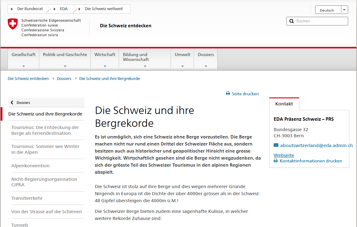 È impossibile immaginare la Svizzera senza le montagne. Non solo le montagne costituiscono circa un terzo della superficie della Svizzera, ma sono anche molto importanti dal punto di vista storico e geopolitico. Sono fondamentali anche da un punto di vista economico, poiché la maggior parte del turismo svizzero si svolge nelle regioni alpine. Molte informazioni interessanti si trovano sul sito del Dipartimento federale degli affari esteri (DFAE).
