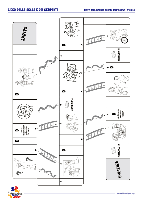 Questa guida online ha lo scopo di accompagnare i e le docenti del 1° ciclo nella progettazione di un percorso didattico basato sul metodo mystery illustrando tutti i passi necessari per lavorare in e con la classe. Il valore aggiunto della guida è il fatto che lascia la libera scelta del tema che si vorrà toccare in classe.Schede sui diritti dell'infanzia 2019 | Gioco delle scale e dei serpenti