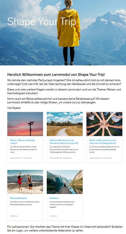 Dove si potrebbe andare in vacanza per divertirsi e fare festa? Quanto è rispettoso del clima viaggiare in auto? E cosa aiuta a risparmiare denaro e ambiente quando si pernotta? Queste e molte altre domande sono discusse in questo modulo di apprendimento che incoraggia le e i giovani a riflettere sul tema del "viaggio sostenibile" e ad esplorare il loro potenziale di azione.Partecipa! Cambia il tuo mondo in quattro passi