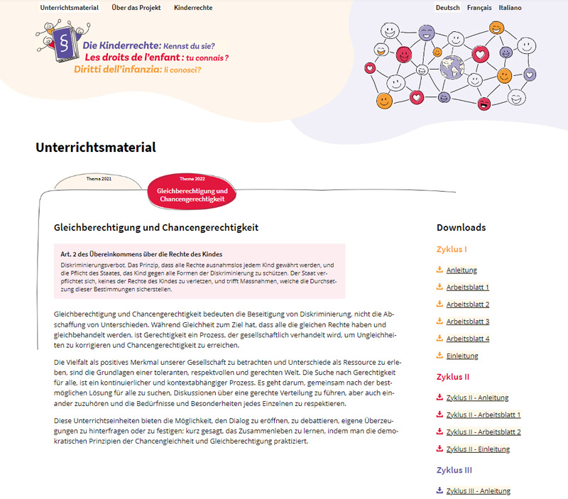 Il diritto alle pari opportunità e all’uguaglianza è il tema di queste schede didattiche che offrono agli insegnanti l'opportunità di esplorare i diritti dei bambini con le loro classi. Gli allievi vengono introdotti agli argomenti attraverso attività ludiche e poi imparano a conoscere i principi democratici di pari opportunità e uguaglianza attraverso metodi partecipativi.