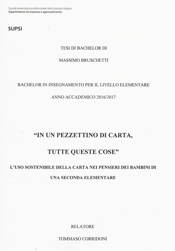 Questo lavoro di Bachelor presenta un percorso sulla carta e il suo consumo pensato in un’ottica di sviluppo sostenibile con l’obiettivo di favorire la costruzione di un pensiero sostenibile in un bambino di seconda elementare. Basandosi su diverse esperienze svolte dai bambini sul riutilizzo e il riciclo della carta e ad uno sguardo su come viene fatta e come si smaltisce, l’insegnante ha potuto raccogliere le concezioni dei bambini sul ciclo di vita della carta e osservarne quantitativamente e qualitativamente l’evoluzione.