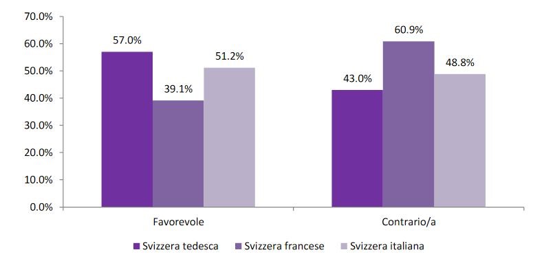 Fonte: https://www.bonus.ch/Pdf/2020/Telefonia-mobile-5G.pdfLe risposte relative alle motivazioni dei partecipanti contrari al 5G fanno rilevare differenze regionali importanti. I rischi per la salute sono la prima preoccupazione per il 75.6% degli Svizzeri italiani, mentre questo dato arriva unicamente al 41% sul versante germanofono; gli Svizzeri tedeschi sono in effetti significativamente divisi tra l'aspetto della salute e quello relativo ai rischi ambientali: il 40.4% degli utenti di questa regione linguistica si preoccupa principalmente dell'impatto ambientale del 5G, percentuale che scende al 17.1% per gli Svizzeri di lingua italiana e al 25.7% per i Romandi.