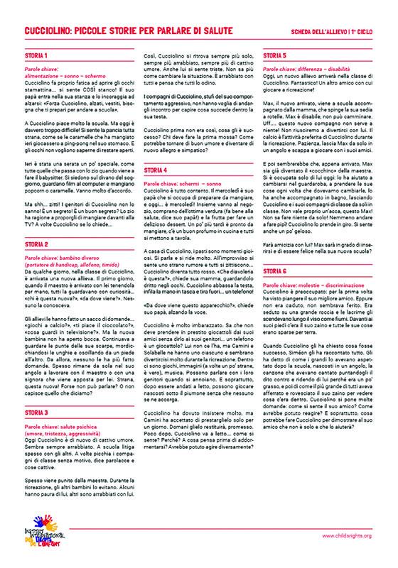 Per il primo ciclo, le attività si basano sulle storie di Cucciolino e sulla creazione di un grande fiore ispirato ai diritti del bambino.