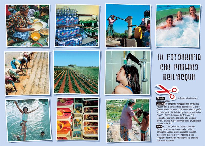 La raccolta di fotografie propone una serie di immagini per affrontare i temi proposti nella scheda d’attività per allieva/o: acqua nel tempo libero, accessibilità all’acqua potabile, consumo dell’acqua, acqua nell’agricoltura, ecc. Dalla raccolta di fotografie bisogna ritagliare due immagini per ogni tema, una del sud, l'altra del nord del mondo, da incollare negli appositi spazi sulla scheda d’attività come indicato nella scheda docenti. Consiglio di utilizzare una stampante a colori per ottenere il risultato migliore.